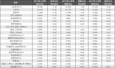 从表1可以看出:2013年上半年馆配结构依旧是“热点依热,冷门亦冷”,一方面,工业技术、文学、经济类三驾马车依旧领跑;而另一方面,排名尾10的 类别依旧低位“蚁附”,十者相加的馆配码洋总份额与排名第五的“政治法律”类体量相当。品类结构失衡的现象依然严重,这也从另一个侧面揭示了出版业的跟 风、同质化、非理性竞争状况没有根本改观。