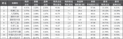 2013年当年出版的新书馆配中,馆配TOP10的出版社码洋占有率合计为39.67%,与2012年上半年TOP10的38.57%相比,上升了1.10个百分点。TOP10的出版社中,科学出版社保持一贯的龙头之势,以6.25%的码洋占有率位居新书馆配出版社排名榜首,人民邮电出版社紧随其 后,码洋占有率较2012年同期提升2.38个百分点,排名上升4个位次,新书馆配地位的提升有效地提高了其在整体馆配市场的地位。(见表7)