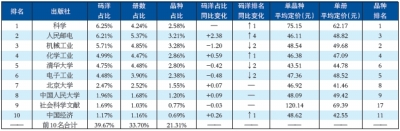 整体TOP10的出版社均是来自北京地区,2013年上半年参与馆配的241家京版社合计贡献了67.87%的码洋份额,较去年同期上升0.34个百分点,表明馆配集中度之高,从另一方面说明馆配竞争之激烈。2013年上半年共有108家大学社参与馆配,TOP10的大学社中来自北京地区的有4家,TOP10大学社码洋合计占到11.03%,相较于去年同期下降了0.89个百分点。(见表4)