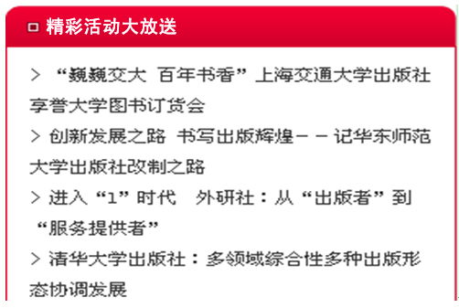 在“精彩活动大放送”栏目首页面中显示各社在展会期间举办活动的照片或活动报道标题,链接到相关活动报道文章。保留一个月。活动内容包括展会期间各出版社举办的新书发布会、专题研讨会、作家交流会、读者见面会、图书签售会以及各类讲座、座谈会等多种形式的活动。