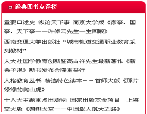 (四)经典图书点评榜 在“经典图书点评榜”栏目首页面中显示图书推介文章标题,链接到图书推介文章。保留一个月。图书推介文章内容包括各社参展图书的书讯、书评、书摘等。