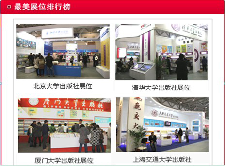 (六)最美展位排行榜 在“最美展位排行榜”栏目首页面中显示展位照片和出版社名称,链接到展位文字介绍。保留一个月。