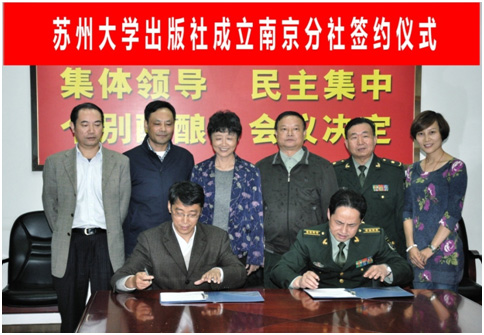 2013年10月30日,苏州大学出版社南京分社成立签约仪式在南京军区疾病预防控制中心会议室举行。南京军区疾病预防控制中心主任李丙军,健康教育与信息情报所所长姜志宽、研究员吴文智、丁凌云和苏州大学出版社社长张建初、总编辑沈海牧、副总编辑袁勇志、原社长高敏、对外合作部主任李寿春等参加了签约仪式。