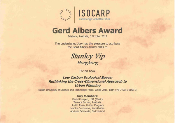 国际城市与区域规划学会(International Society of City and Regional Planners, ISOCARP)的2013年周年大会于10月3日在澳大利亚布里斯班市举行,会议公布并颁发了2013年度的“葛德·阿尔伯斯奖”(Gerd Albers Award)。 此奖是纪念学会的创始人之一、德国知名规划师葛德·阿尔伯斯, 用以表彰国际上出色和有影响力的城市规划著作。本年度的获奖图书是由叶祖达博士所著的《低碳生态空间:跨维度规划的再思考》(大连理工大学出版社,ISBN 978-7-5611-6063-3,2011出版)。