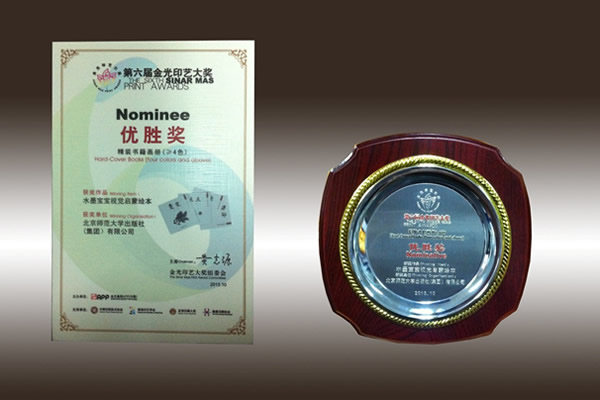 2013年10月,第六届金光印艺大奖颁奖典礼在杭州举行,北京师范大学出版社出版的《水墨宝宝视觉启蒙绘本》(点击查看)丛书喜获优胜奖殊荣。