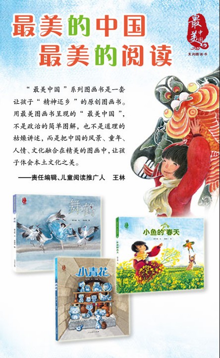 此次人教社入选的《最美中国系列图画书》共有三册:《小青花》《小鱼的春天》《舞鹤》,是一套让孩子“精神还乡”的原创图画书。用最美图画书呈现的“最美中国”,不是政治的简单图解,也不是道理的枯燥讲述,而是把中国的风景、童年、人情、文化融合在精美的图画中,让孩子体认本土文化之美。