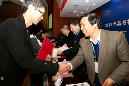 2013年,全国大学生数学建模竞赛规模再创新高,来自全国33个省、市、自治区(包括香港、澳门特别行政区)以及新加坡、印度和马来西亚的1326所院校、23339个队(其中本科组19892队、专科组3447队)、70000多名大学生参加了本项赛事。厦门大学、成都工业学院分获本科组、专科组“高教社杯”。林金安副总编辑与主席台就座的领导和嘉宾为获奖者颁发了证书和奖杯,对获奖赛区、指导教师和学生表示祝贺,并表示,高教社将一如既往地支持全国大学生数学建模竞赛,支持全国高校数学课程教学改革。