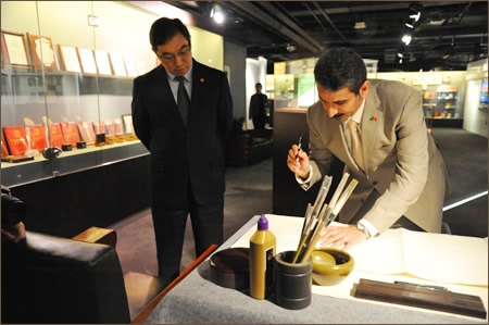 苏雨恒社长对萨利赫•古苏米参赞来访表示热烈欢迎,并陪同其参观了高教社博物馆。苏雨恒社长向来宾详细介绍了博物馆的陈列展览内容,参观结束后,萨利赫•古苏米参赞在留言簿上留言。