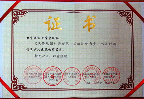 “首届海淀少儿优秀作品评选”由中共北京市委海淀宣传部、精神文明办、文化委组织发起,面向全国评选优秀少儿作品。北京语言大学出版社《汉语乐园》(精装版)在此次评选活动中荣获“优秀少儿出版物作品”奖。