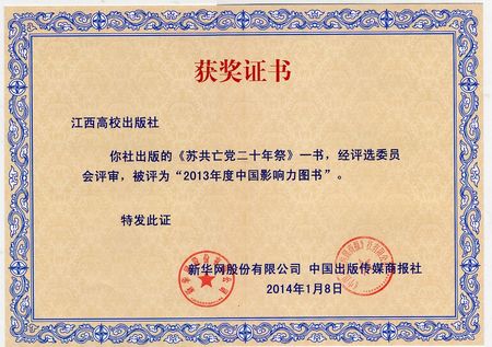 由新华网、中国出版传媒商报社共同主办的以“阅读,点亮梦想之旅”为主题的“2013年度中国影响力图书”评选揭晓,并于2014年1月8日在新华社举行颁奖大会。江西高校出版社出版的《苏共亡党二十年祭》以社科类图书头名入选,花传贵副社长代表江西高校出版社参加颁奖活动。