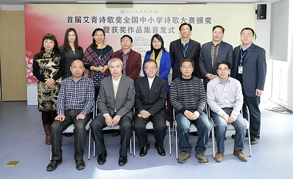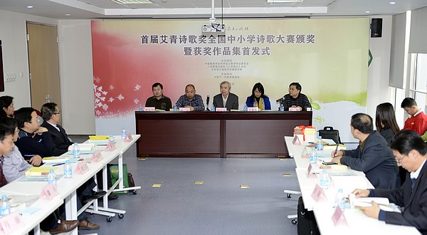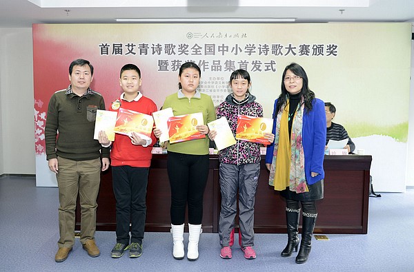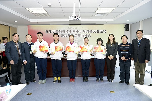2014年1月10日,由中国教育学会中学语文专业委员会、人民教育出版社、中共浙江省金华市委宣传部联合举办的以“爱”为主题、公益性的首届艾青诗歌奖全国中小学诗歌大赛颁奖暨获奖作品集首发式在人教社举行。此次首发式邀请了部分在京选手参加颁奖仪式,另有人民日报、新华网、中国教育报、中国新闻出版报、中国图书商报、百道网等媒体到场。人教社副社长罗先友及人教社中语室、小语室、大众图书室、社办相关人员与会。