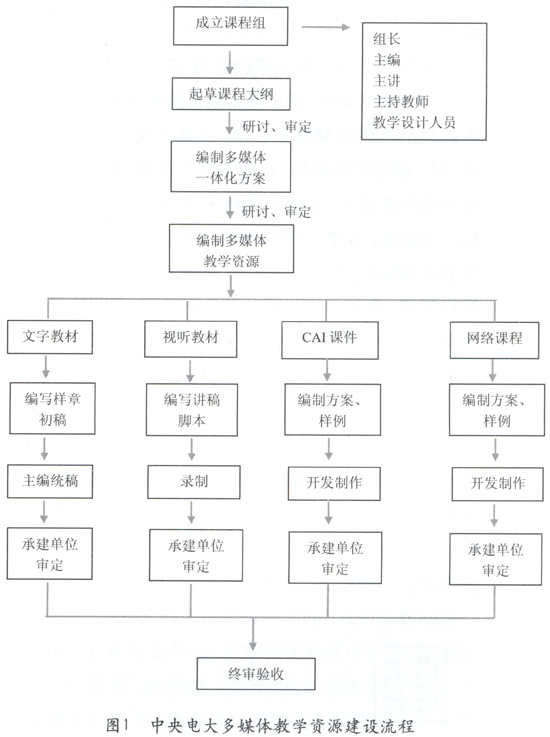 按照中央电大教学资源建设要求,课程组应该由学科专家、远程教育或教育技术专家、经验丰富的教学人员、教材编辑人员和技术人员构成,组内分工包括课程组组长、主编、主讲、主持教师、教学设计人员、编辑制作人员等。优质教学资源的建设需要课程组严格按照既定的多媒体教育资源的一体化设计方案和流程要求,精心组织实施和共同协作完成。