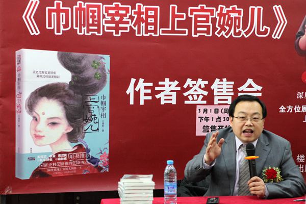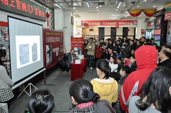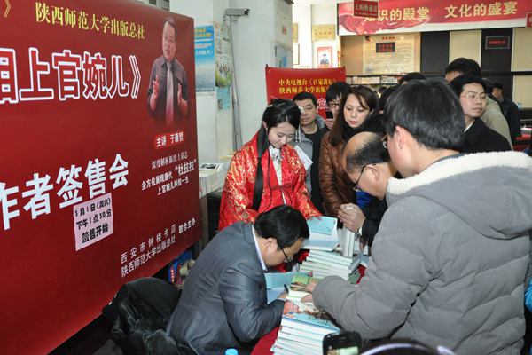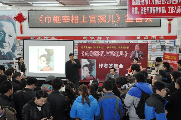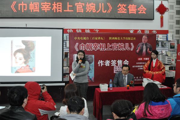 总社大众分社社长郭永新由上官婉儿墓在咸阳被发现切入,说到陕西是一个处处有遗产,步步有文化的地方,而陕西师大出版总社会努力挖掘陕西文化资源,不断呈现出版精品。《巾帼宰相上官婉儿》策划编辑姚蓓蕾介绍了图书封面的形成过程与图书看点。于赓哲教授逐行逐字解析上官婉儿墓志的环节将现场气氛引向高潮。虽然仍有争议存在,但于教授还是以他的研究成果,对上官婉儿的籍贯、成长历程、党羽派系、遇害真相的问题给现场观众做了答复。随后,于教授为购书读者签名并合影留念,活动持续了3个小时后圆满结束。