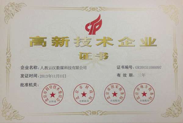 根据科技部、财政部、国家税务总局《高新技术企业认定管理办法》(国科发火[2008]172号)和《高新技术企业认定管理工作指引》(国科发火[2008]362号)的规定,以及全国高新技术企业认定管理工作领导小组办公室《关于高新技术企业更名和复审等有关事项的通知》(国科火字[2011]123号)的要求,经企业申报,市科委、市财政局、市国税局、市地税局等地方初审,专家评审以及公示等程序,人民教育出版社所属的人教云汉数媒科技有限公司被认定为国家高新技术企业,成为北京市2013年第一批被认定为高新技术企业的单位之一。
