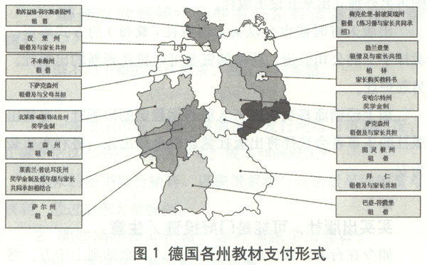 德国教材的选用自主权在学校和教师。购买教材的支付方式在不同的州也不同,比如,柏林地区主要由家长来支付教材费用,而有的州是由学校或社区来支付,还有介于两者之间的支付方式。德国各州教材支付形式如图1所示: