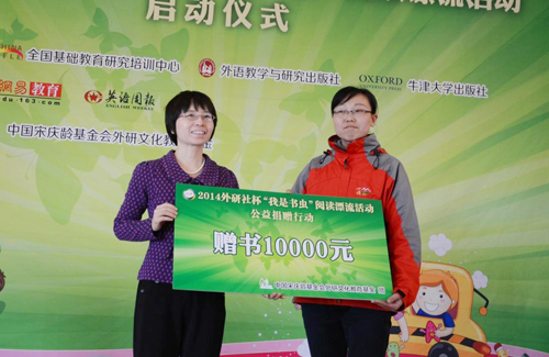 启动仪式上,外研社副总编辑章思英女士为民办打工子弟学校——北京振兴小学捐赠了价值10000元的英语阅读漂流用书。