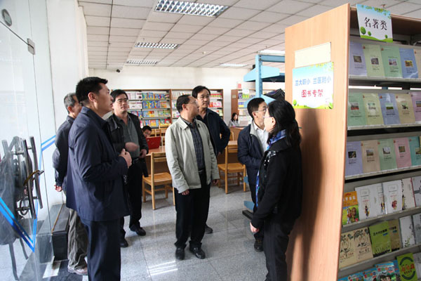 后勤处处长刘佛军、副处长孙立国,出版社社长崔明、总编辑雷鸿昌、副总编辑魏春玲、办公室主任魏鸿彪一起查看该社援建的兰大职小、兰医附小图书专架。