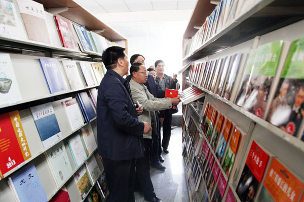 后勤处处长刘佛军、副处长孙立国,出版社社长崔明、总编辑雷鸿昌、副总编辑魏春玲、办公室主任魏鸿彪一起查看兰州大学出版社援建的兰医附小图书资料室。