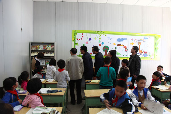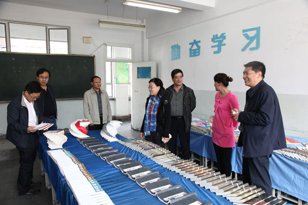 后勤处处长刘佛军、副处长孙立国,出版社社长崔明、总编辑雷鸿昌、副总编辑魏春玲、办公室主任魏鸿彪一起查看该社援建的兰大职小教室图书角。