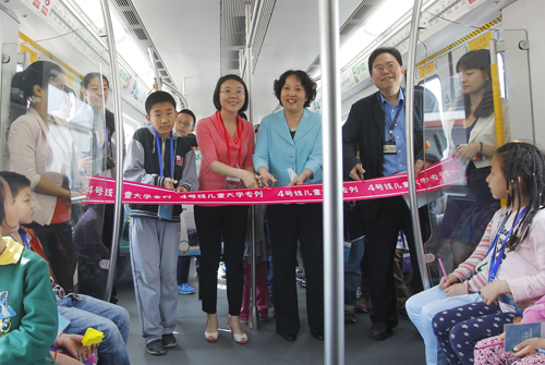 偌大的车辆段轨道中,一辆特别装饰的“4号线儿童大学专列”缓缓驶出,京港地铁公司副总经理郑燕平、外研社党总支副书记何皓瑜、京港地铁工程总管陈耿森,以及2013年4号线儿童大学学员代表鞠龙共同为4号线儿童专列剪彩。4月27日,由京港地铁与外研社携手举办的大型文化公益项目——2014年4号线儿童大学正式启动。