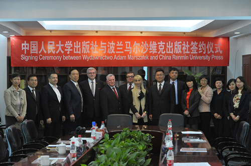 会上,马尔沙维克先生向人民大学赠送了李铁映主编的《中国经济体制改革重大事件(1978—1991)》波兰文版。双方就在出版领域建立长期合作的问题进行了深入讨论。会见结束后,波兰马尔沙维克出版社代表团来到中国人民大学出版社访问,双方举行了版权合作签约仪式。本次签约图书有5本,其中三本是人民大学出版社授权马尔沙维克出版社出版波兰文版,分别是黄卫平的《双赢的未来》、程天权的《中国之路》和杨凤城的《中国共产党就是这样成功的》。另外两本书是波兰马尔沙维克出版社授权人民大学出版社出版中文版,分别是约安娜·马尔沙维克-卡瓦所著的《加入欧盟后的波兰:议会的系统性定位及作用研究》和安德杰·拉齐明斯基的《波兰史》。
