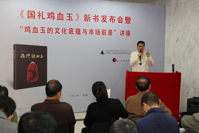 2014年4月23日上午,《国礼鸡血玉》新书发布会暨“鸡血玉的文化底蕴与市场前景”讲座在广西师范大学出版社办公楼一楼大堂隆重举行,桂林鸡血玉专家、社会各界人士及媒体近百人参加了发布会。