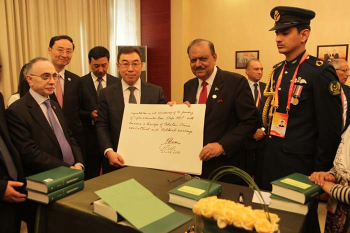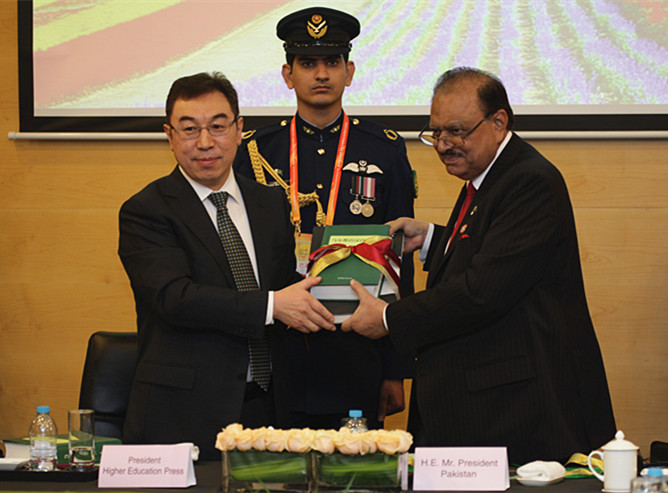 发布会后,侯赛因总统在贵宾室为高教社题词:“Congratulations to the 60th anniversary of the founding of Higher Education Press! Hope Higher Education Press will become the bridge of Sino-Pakistan cultural and educational exchanges.”(祝贺高等教育出版社建社60周年,希望高等教育出版社成为巴中文化教育交流的桥梁。)苏雨恒社长接受侯赛因总统题词。