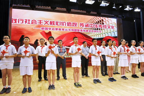 5月30日上午,“践行社会主义核心价值观 传承中华传统文化——新国学启蒙教育丛书捐赠暨基地建设启动仪式”在北京十二中举行。中国关心下一代工作委员会主任顾秀莲,原文化部常务副部长、中华文化促进会主席、北京高占祥文化艺术基金会名誉理事长高占祥,北京市关工委主任范伯元,教育部社科司副司长徐艳国,团中央学校部部长杜汇良,丰台区书记李超钢,中国人民大学校长助理、人民大学出版社总编辑贺耀敏,基金会理事长高青等嘉宾出席了仪式,由丰台区区长冀岩主持活动。