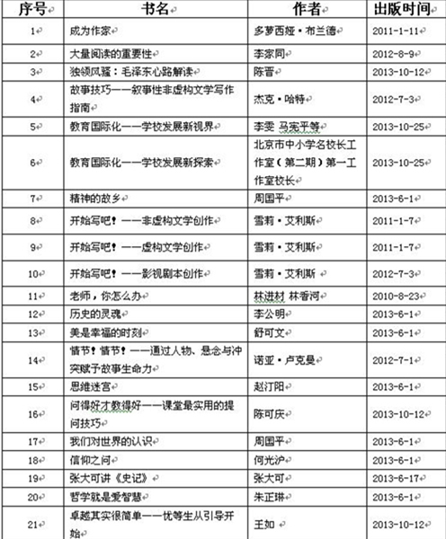 为加强中小学图书馆建设,提高图书配备质量,推荐适合中小学校师生阅读的优质图书。2014年1月起教育部基础教育课程教材发展中心组织专家对各出版社推荐的图书进行评选。经专家评选,中国人民大学出版社送审的图书21种图书入选《2014年中小学图书馆(室)推荐书目》。本次入选的图书有“创意写作书系”的《开始写吧!——非虚构文学创作》、《开始写吧!——虚构文学创作》、《开始写吧!——影视剧本创作》,“爱智书系”的《历史的灵魂》、《美是幸福的时刻》、《精神的故乡》、《思维迷宫》、《我们对世界的认识》、《信仰之问》、《哲学就是爱智慧》等。详细书目如下: