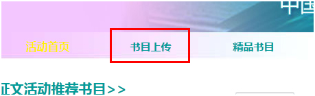 1、使用中国大学生在线注册账号登录上传页面,点击导航栏“书目上传”;
