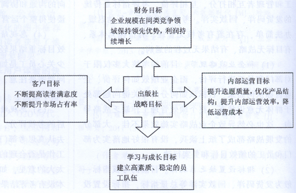 显然,不能再局限于规模、利润等传统的、短期性的财务目标,必须从多方面来考虑支撑战略目标实现的关键驱动因素。借助平衡计分卡理论的四个维度构架(财务维度、客户维度、内部运营维度和学习成长维度)和战略地图的思想,出版企业的战略目标需要财务、客户、内部运营、学习和成长四个维度的关键驱动因素的支撑:企业规模的壮大和利润的增长来源于企业对于读者需求的有效满足,员工、企业文化等学习和成长维度的因素支撑了企业运营体系的高效率,内部运营的关键性流程创造并满足了客户需求,促使财务和客户方面的目标有效达成,财务、客户、内部运营、学习与成长这四个维度之间又有着清晰的因果关系,共同支撑和确保企业价值和战略目标的实现。如下图所示: