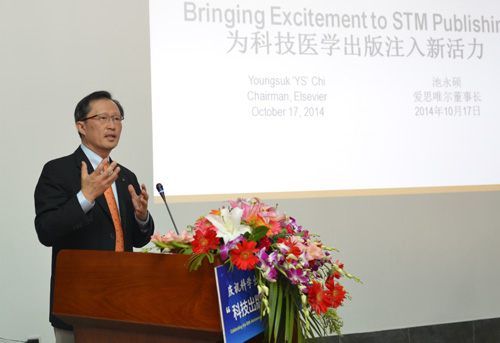 爱思唯尔公司董事长池永硕先生以《为科技医学出版注入新活力》为题发表主题演讲。他通过六个以字母“E”打头的英文单词,即,提升 (Enhance),扩展 (Expand),简易(Easy),体验 (Experiential),试验 (Experiment),和参与 (Engage),深入浅出地阐释了未来科技医学出版的发展趋势。这六个关键词还生动揭示了从信息时代到网络时代,科技医学出版商应如何调整自身角色及战略规划来满足科研工作者不断变化的需求,并为其带来最佳的用户体验,从而更有效地推动科学和社会进步。