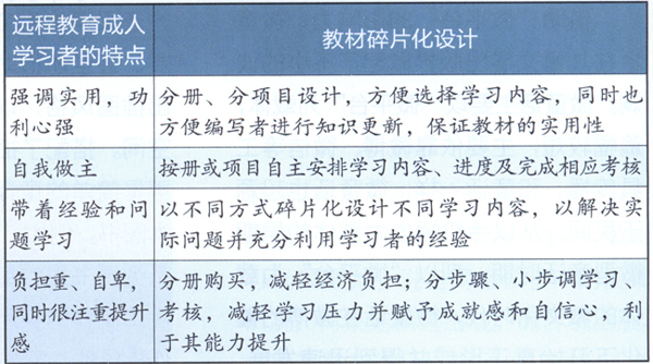 表1:教材碎片化设计与远程教育成人学习者特点之间的关系