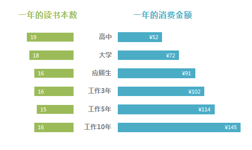 据掌阅研究,学生读者读书数量多,但消费较少,职场读者读书目标性更强,消费意愿也更大。大学读者人均年读书量为18本,年消费金额72元,而工作10年的读者人均年读书量为16本,年消费金额达到145元。
