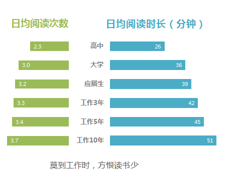 从年龄分布看,68%的数字阅读用户为25岁以下的恰同学少年。从阅读时长上来看,大学生平均每天阅读36分钟,而后逐年增加,工作10年的读者,平均每天在阅读上花费51分钟。