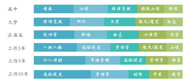 在阅读内容方面,各个阶段读者群都有鲜明的特点:高中生关注感情居多;大学生爱好广泛,悬疑、励志、科幻、文学散文等内容全部收下;应届生特别关注成功学和职场书籍;工作3年的读者开始关注人际人脉、通俗说史类书籍;工作5年后的读者开始关注个人理财;工作10年后的读者,历史成为了他们最大的阅读兴趣,中医养生也被放到了书架上。