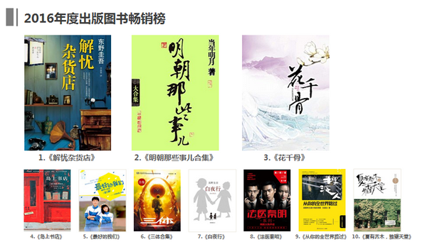 2016年度出版图书畅销榜上,除了去年经典依旧入围,也有类似《法医秦明》这样的黑马出现。其TOP10为:《解忧杂货店》、《明朝那些事儿》、《花千骨》、《岛上书店》、《最好的我们》、《三体》、《白夜行》、《法医秦明》、《从你的全世界路过》、《夏有乔木雅望天堂》。