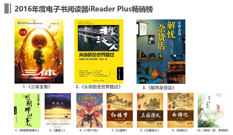在掌阅推出的电子书阅读器iReader Plus中,2016年最畅销的十本书分别是《三体合集》、《从你的全世界路过》、《解忧杂货店》、《明朝那些事儿合集》、《摆渡人》、《斗罗大陆》(漫画)、《红楼梦》、《三国演义》、《西游记》、《微微一笑很倾城》,阅读器读者对于出版书和古典名著的喜爱可见一斑。