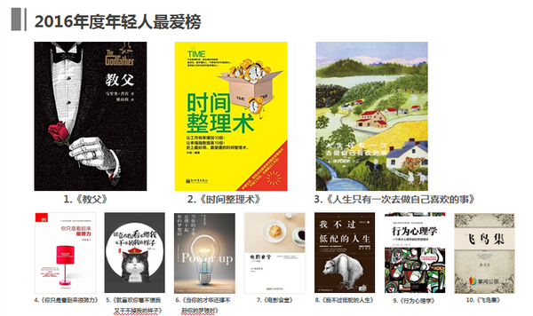 针对年轻群体,掌阅发布了2016年度25岁以下年轻人最爱榜,《教父1》强势登顶,《时间整理术》、《人生只有一次,去做自己喜欢的事》、《你只是看起来很努力》、《就喜欢你看不惯我又干不掉我的样子》等励志成长类书籍分列2至5位。