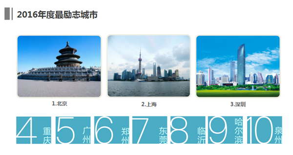 掌阅统计了2016年度最励志城市榜,北京、上海、深圳、重庆、广州居于前五名,郑州、东莞、临沂、哈尔滨、泉州排名六至十名。 北京上榜,实至名归,在线下,北京是拥有最多“24小时书店”的城市,三联书店在黑夜中指路;在线上,依然是最励志的城市。北京不仅有全宇宙最贵的房子和最浓厚的霾,更有一众挑灯夜读的年轻人。