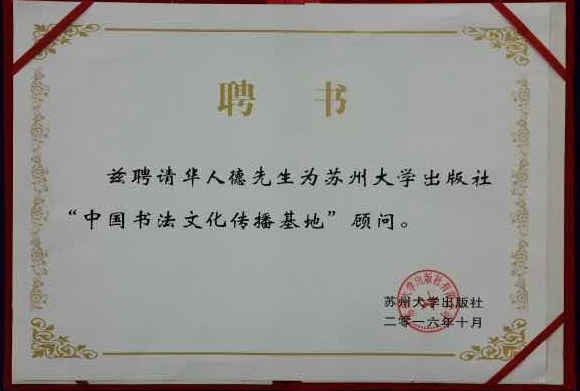华人德为苏州大学艺术学院设计艺术学专业中国书法史和碑刻史研究方向博士生导师,中国书法家协会隶书委员会副主任,曾任苏州市书法家协会主席,其书法作品道法自然,守望传统,无论是书法艺术,还是书学研究,都臻于至境。