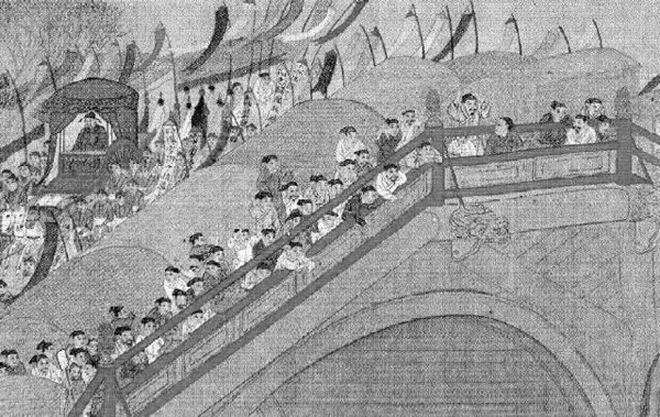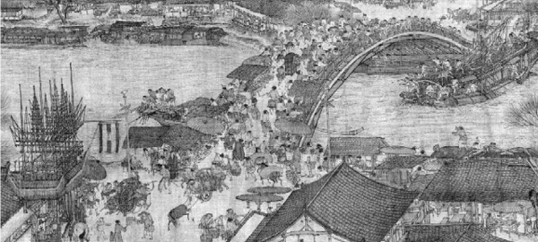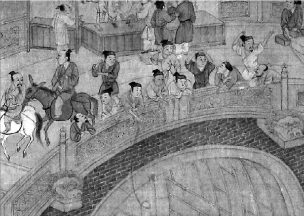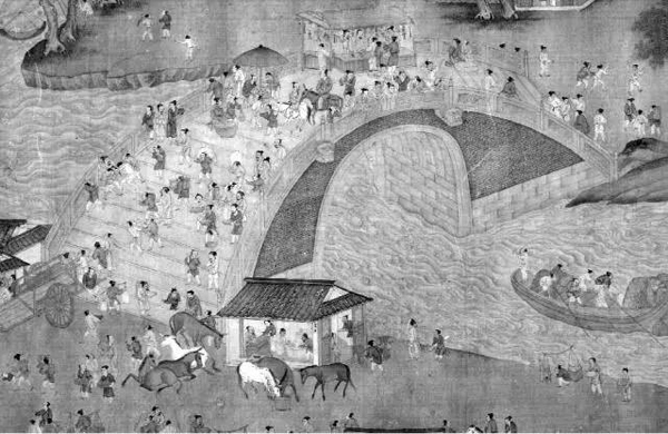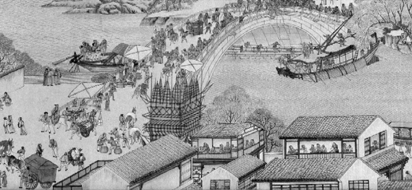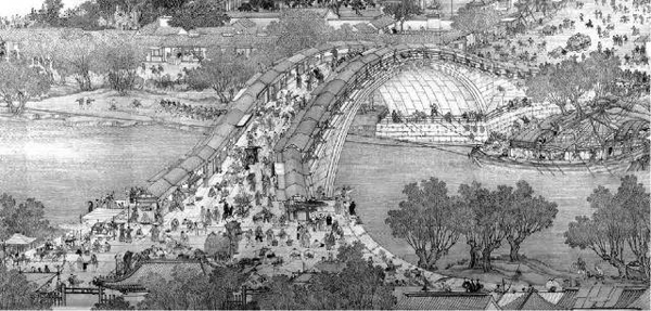 各版本《清明上河图》中,虹桥及其周边的市井场景,都构成了绘画的核心内容。交通节点、观景休憩、商品交易,桥的三种功能相辅相成,影响着人们的日常生活模式。