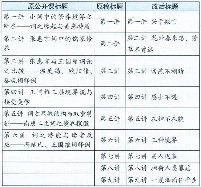 与书名相比,篇章名在学术著作中更容易被忽视。《小词大雅》的底稿虽以公开课的内容为基础,但最后交稿时做了整理和修订。原稿为六讲,每讲有一个标题,交稿时根据成稿篇幅略微调整,变为九讲,每讲没有标题。编辑人员在反复通读、反复斟酌后,为每讲加上了新标题,如下表。