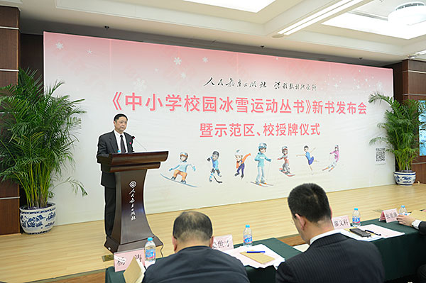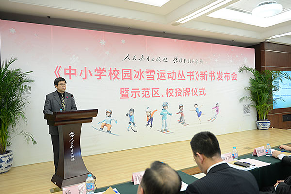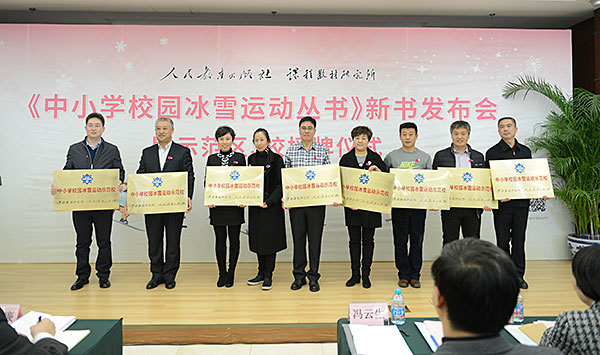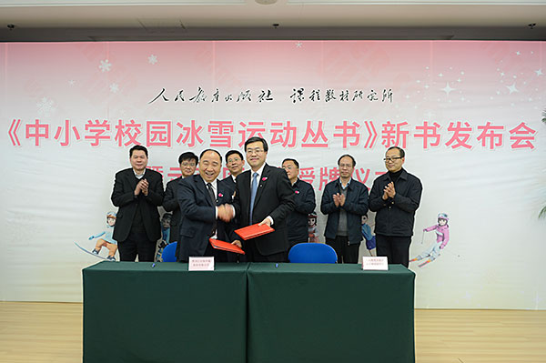 3月7日,《中小学校园冰雪运动丛书》新书发布会暨示范区示范校授牌仪式在人民教育出版社举行,宣布该套丛书将于2017年秋季正式进入全国中小学校园。黑龙江省委常委、宣传部部长张效廉,中国教育出版传媒集团党组书记、董事长冯云生共同为新书揭幕。教育部体卫艺司巡视员廖文科、新闻出版广电总局出版管理司副司长袁越伦,国家体育总局冬季运动管理中心副主任姜世才,黑龙江省委宣传部常务副部长杨殿军,黑龙江省体育局党组书记、局长杨涛,河北省教育厅副厅长李胜利等领导以及人教社社领导、教材编写专家、示范区示范校代表、地方教育行政部门和出版集团近百余人参加了活动。