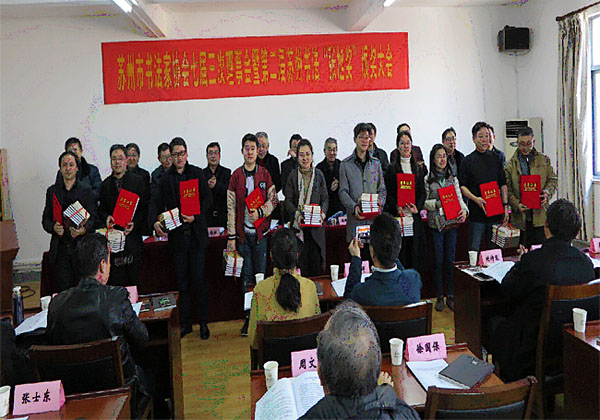 会上,张建初董事长向大会致辞,代表出版社欢迎参加本次会议的代表。会议听取了由市书协副主席王国安所作的2016年度协会工作总结和2017年苏州书协工作计划。并向获得第二届苏州书法“张旭奖”的张平、王洁、陈宇等10人分别颁发了学术奖、创作奖和教育奖。 聘任尹国辉为苏州书协志愿服务团执行团长,新聘朱树民为秘书长。