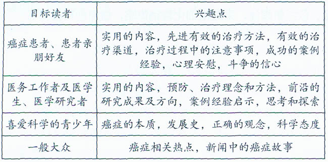 在“互联网+”时代,人人都是自媒体。大浪淘沙后能闯入大众视线的一定是拥有相当多粉丝的网络活跃者,他们的作品也一定有独到之处。今天比以往任何时候都更容易发现和挖据有影口向力和潜力的原创科普作者,笔者就是从微信公众号“奴隶社会”上发现《癌症•真相》作者的,他已经在“奴隶社会”公众号上连载了10多篇关于癌症话题的文章,每篇都有上万的阅读量,并且清一色的好评。作者当时还有一个“健康不是闹着玩儿”的微信公众号,也拥有数量不菲的粉丝,初步估算,在图书出版前,他能影响的粉丝超过10 万人,这都是图书的潜在读者。明确的目标读者群体对图书的内容策划以及市场推广都非常有帮助。