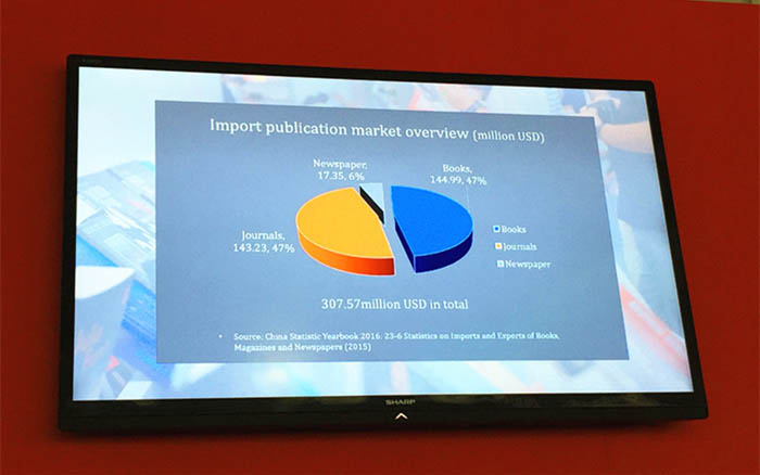 根据2016年中国统计年鉴,2015年中国进口出版物价值高达307.57百万美元,当中图书和杂志占很大比重;近15年间,出版物进口总值增长了7.72倍,其中印刷出版增长了4.9倍,数字出版增长了54.47倍,可见数字出版逐渐成为出版业的发展趋势。“虽然数字出版进口的势头近几年越来越好,但是中国市场仍对印刷出版有很大的需求,因为很多图书馆需要纸质书籍用于馆藏等。”赵元说。