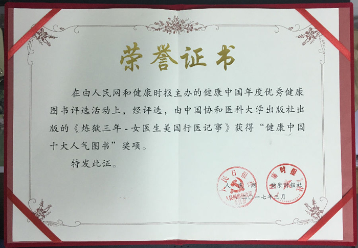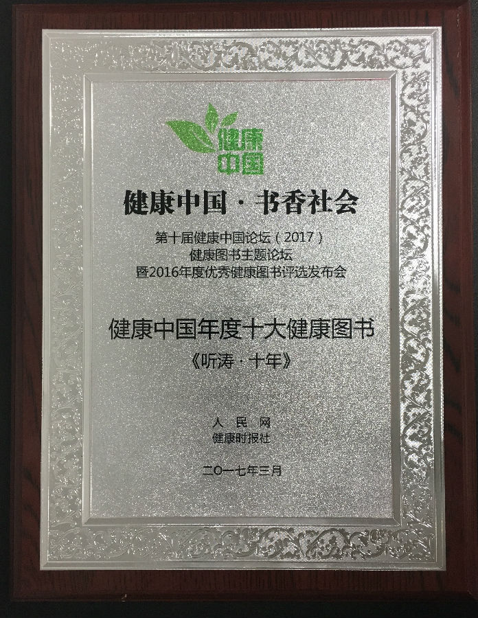 评选发布会上揭晓了2016年度“健康中国年度十大图书”和“健康中国十大人气图书”。在此次评选中,中国协和医科大学出版社编辑出版的《听涛·十年》入选“健康中国年度十大图书”榜单,《听涛·十年》和《炼狱三年-女医生美国行医记事》同时入选“健康中国十大人气图书”榜单。