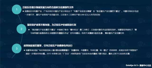 政策因素:版权保护和内容规范管理有利于泛娱乐行业的健康发展。国务院针对电影产业、广电总局针对音乐产业分别出台了“电影产业促进法草案”及“推进音乐产业发展若干意见”。电影市场化步伐进一步被打开,音乐产业得到产业资金支持,以实现十三五期末产值3,000 亿元人民币的目标 “推进音乐产业发展若干意见”中强调了推动“著作权法”第三次修订,以加强对音乐作品的版权保护。国家版权局颁布了“责令网络音乐服务商停止未经授权传播音乐作品”的专项通知,有利于肃清音乐版权乱像, 释放音乐产业发展红利。