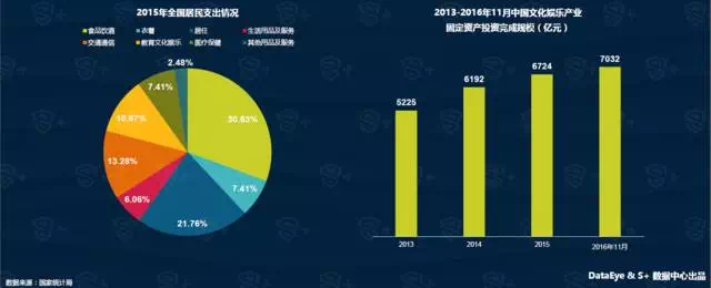 社会和经济因素:群众对泛娱乐的消费已成为社会文化常态。2015年全国居民在教育文化娱乐领域支出环比增长12%,是居民消费各环节中增速最快的。此外,2013-2016年国内文化娱乐产业投资一直保持向上增长态势,在2016年11月投资额已经达到7032亿元,可以看出资本市场看好文娱产业的市场成长空间及相对良好的未来回报。此外随着文学、动漫、影视、游戏为核心的泛娱乐IP, 被互联网原住民的80后、90后甚至更年轻的95后人群消费和传播,再加上国家政策的支持,加速了“泛娱乐”在社会中积极正面的舆论导向。